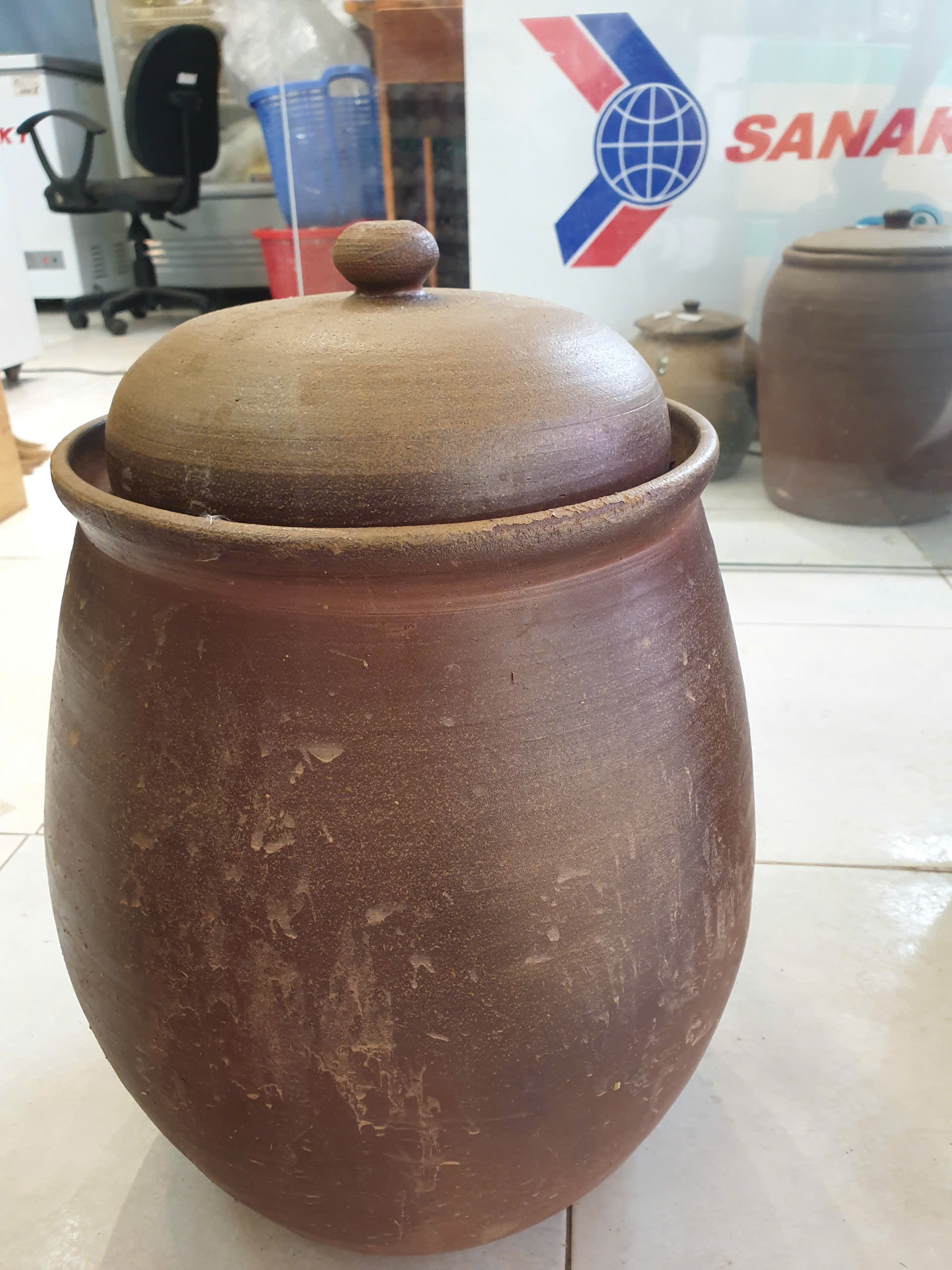 Chum sành thiết kế đơn giản nhưng đầy tinh tế và kín nắp dùng để đựng rượu hoặc gạo, hay có thể để làm đồ trang trí, các thực dưỡng không bay hơi, hở gió hoặc tránh côn trùng hay tạp chất bẩn xâm nhập.